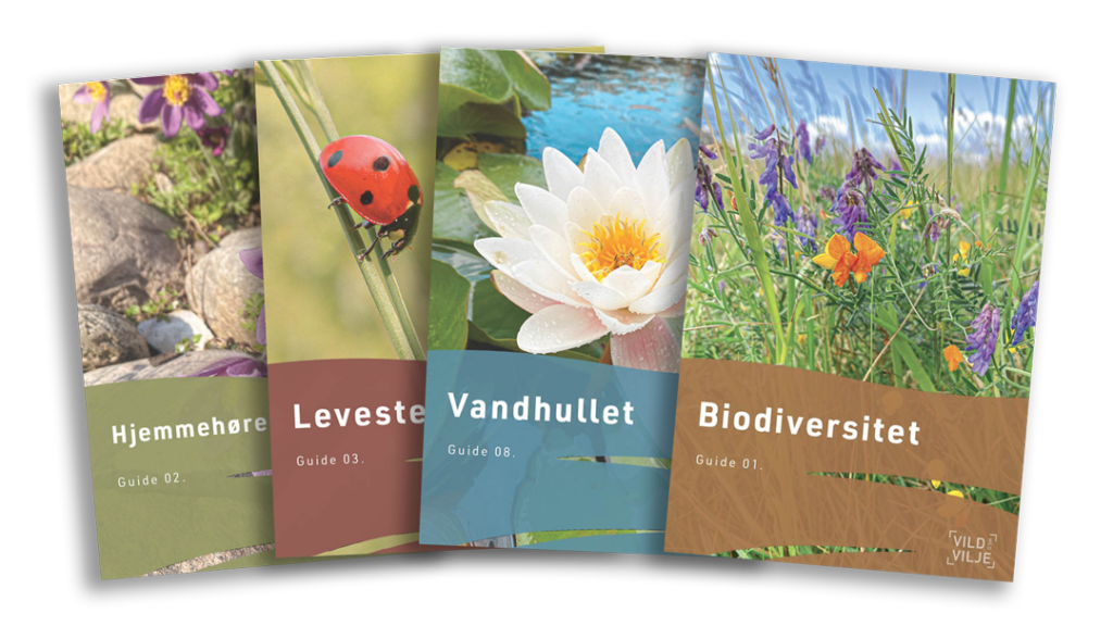 Vild Med Vilje har udarbejdet ni guides. I dem stiller de skarpt på hjemmehørende planter, levesteder, blomsterplanter, jordbunden, slåning, dødt ved, vand og den vilde altan & baggård. Vild Med Vilje ønsker med disse guides at gøre redskaber og viden tilgængeligt for alle , som ønsker at gøre deres arealer vildere.