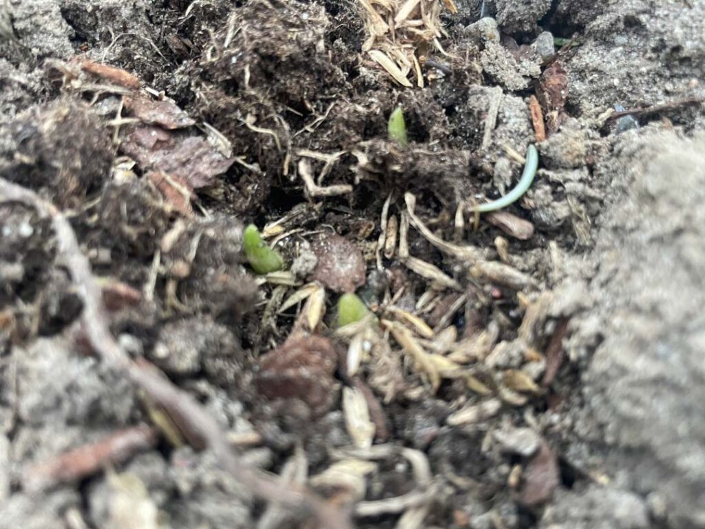 Hvis man kigger godt efter, kan de første tegn på forår ses. Et par vintergækker står og ser lidt forkrøblede ud, og under granafdækning er de grønne skud af ramsløg på vej. På træer og buske i det nye skovbed anes de første knopper.
