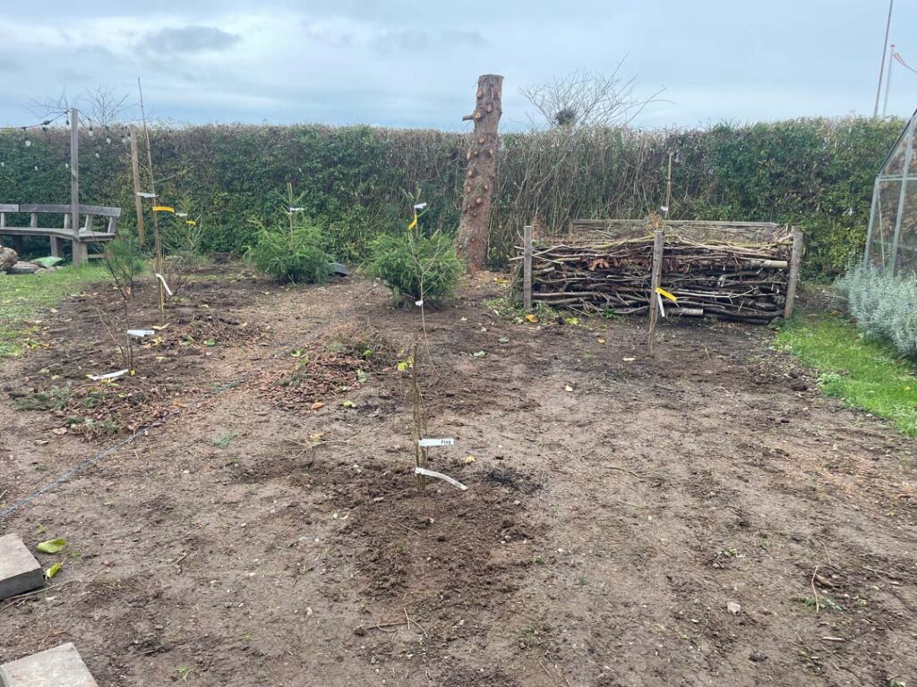 Nu begynder skovbedet for alvor at tage form. De første træer og buske er blevet plantet, og det giver allerede området et helt nyt udtryk. Hvor det gamle grantræ tidligere stod, er der nu bagerst i bedet plantet et par nye rødgraner, en skovfyr og den taks, som tidligere voksede i hækken. Mellem grantræerne er der plantet efterårslyng, som i den kommende sæson vil give farve og liv, når meget andet i haven går på hæld.